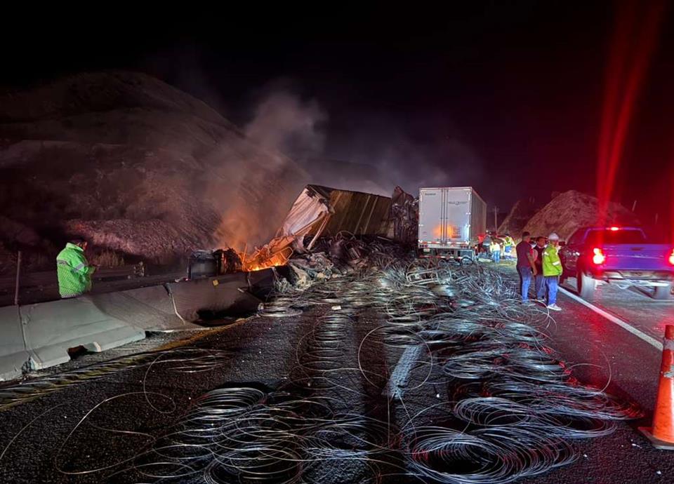 Un choque múltiple e incendio entre cuatro tráileres y dos camionetas dejó como saldo a tres personas heridas.