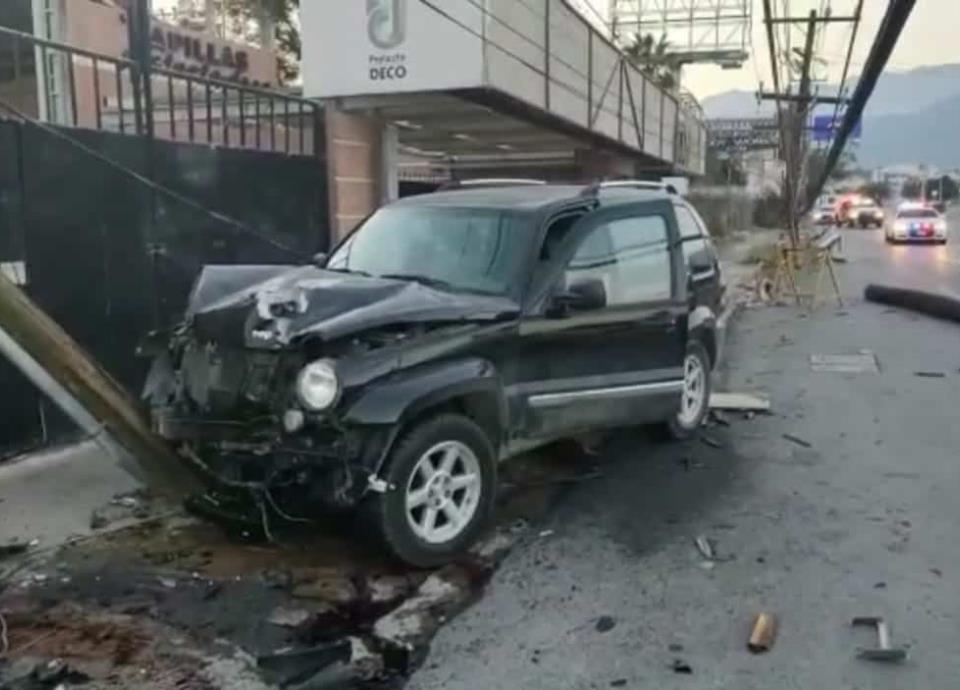 Luego de perder el control de su Jeep, un hombre se estrelló contra dos postes, derribando un transformador, esta mañana en la Colonia Contry, al sur de Monterrey.