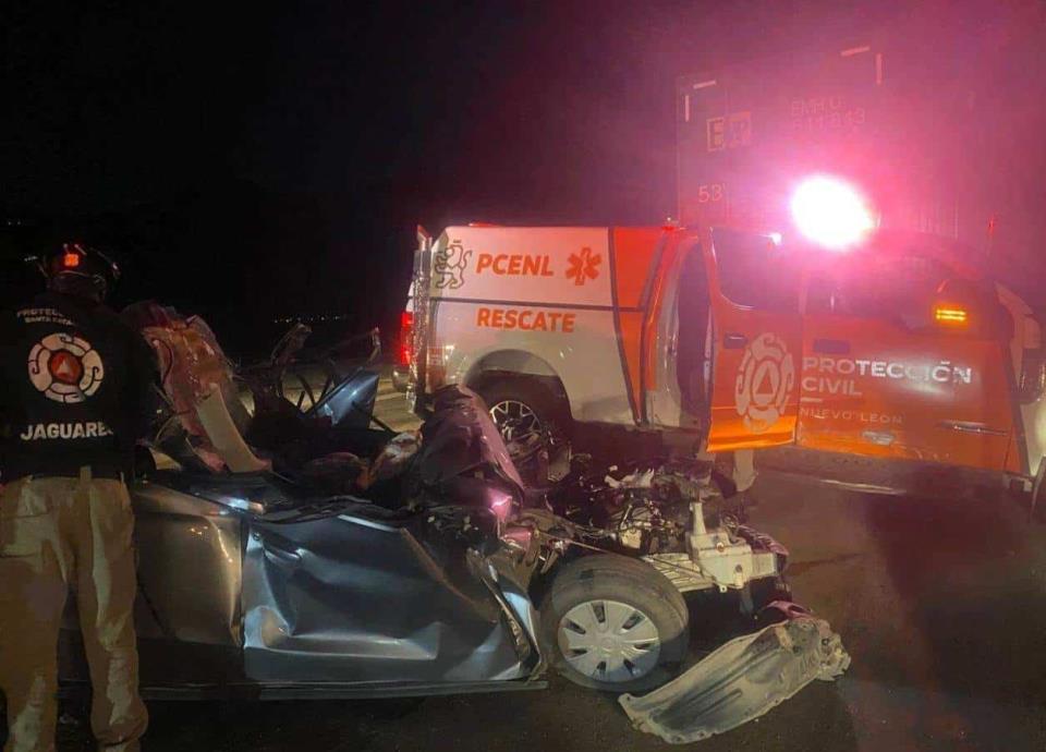 Un saldo de tres muertos y un lesionado dejó el estrellamiento de un vehículo contra un camión de carga en la Carretera a Saltillo, municipio de Santa Catarina.
