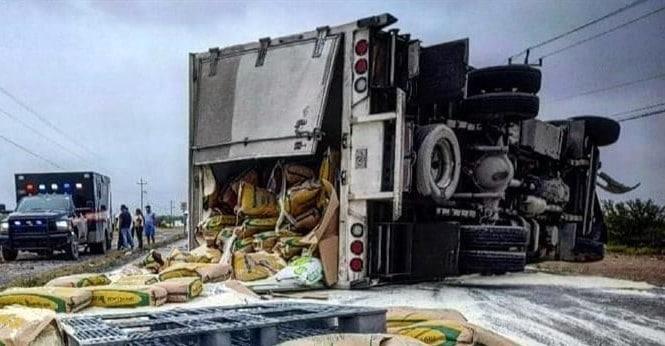 Al momento del accidente, este transportaba un cargamento de siete toneladas de costales de maíz.