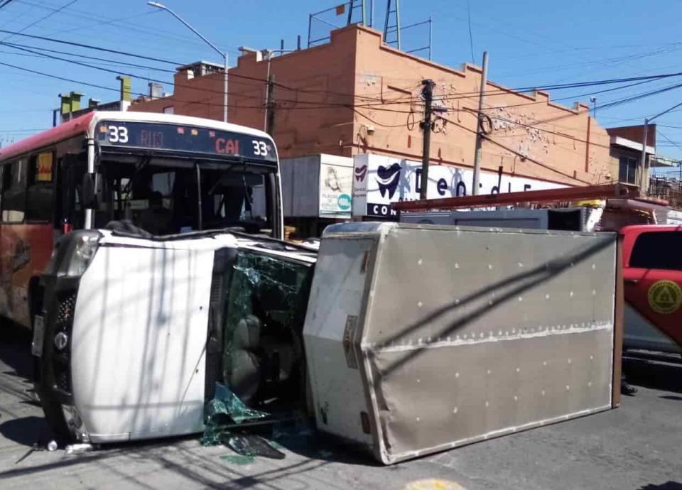 Al menos tres personas lesionadas, dejó un choque volcadura registrado la tarde de ayer en el centro de Monterrey, entre un transporte urbano de la Ruta 113 Canteras y una camioneta de carga.