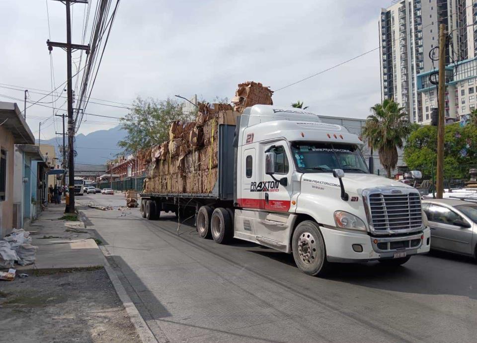 El exceso de altura en la carga que llevaba un tráiler, provocó que derribara cables de telefonía, en el centro de Monterrey.