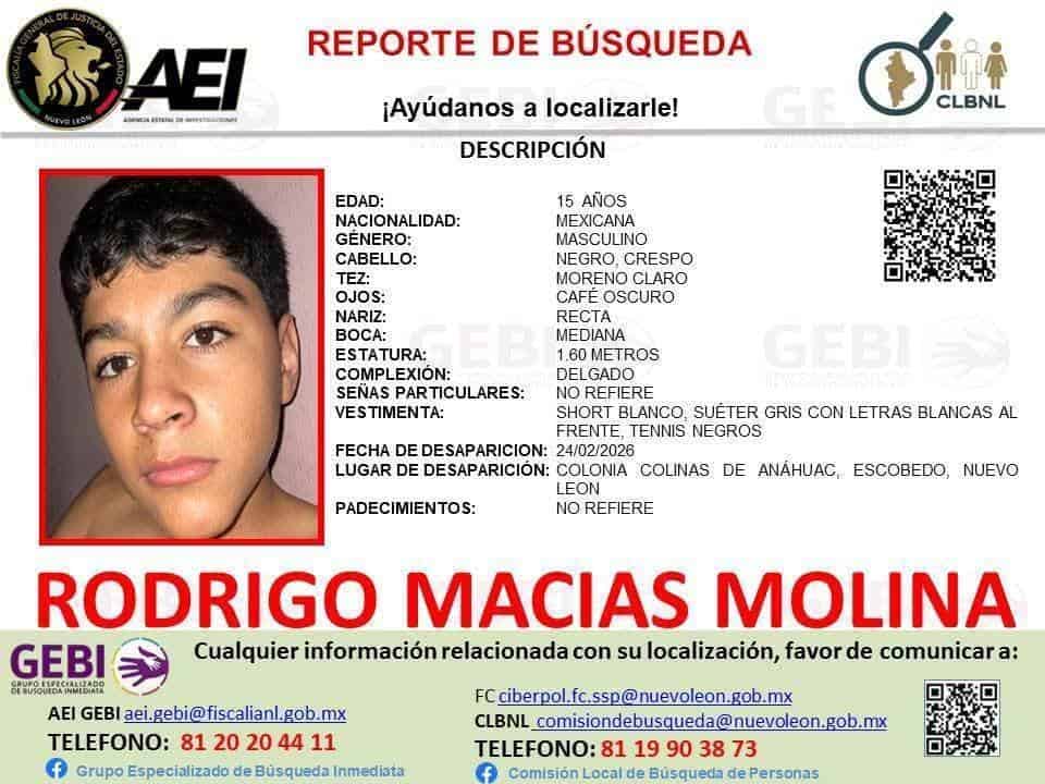 La Fiscalía General de Justicia del Estado solicitó el apoyo de la ciudadanía para localizar a tres adolescentes reportados como desaparecidos en el municipio de Escobedo, quienes son compañeros de escuela y amigos.