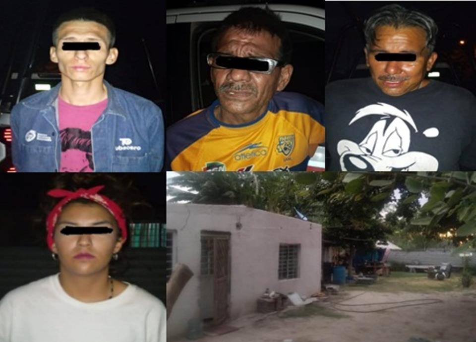 En el sitio fueron detenidos el dueño de la casa identificado como Silvestre “N” y sus acompañantes Mario, “N”, Raymundo, “N” y Evelyn “N”, de 53, 38, 25 y 24 años de edad respectivamente.