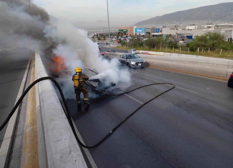 Personal de Bomberos de Nuevo León, llegó al lugar junto con Protección Civil de Monterrey para sofocar las llamas del automóvil.