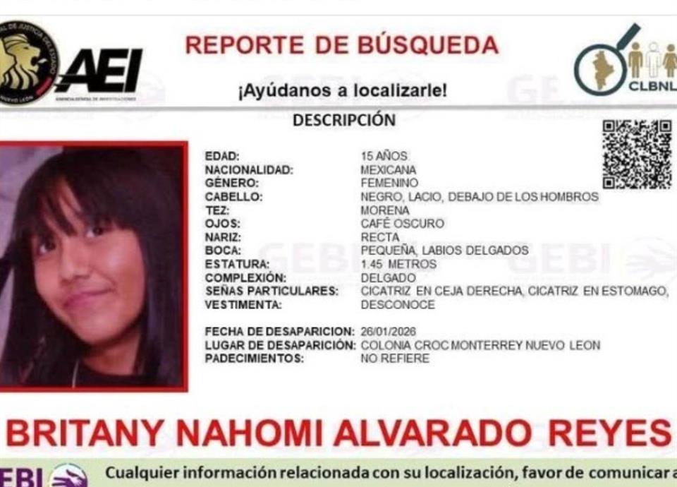 Luego de 11 días reportada como desaparecida, autoridades de la Fiscalía General de Justicia de Nuevo León localizaron el cuerpo sin vida de Britany Nahomi Alvarado Reyes, una joven de 15 años al norte de Monterrey.