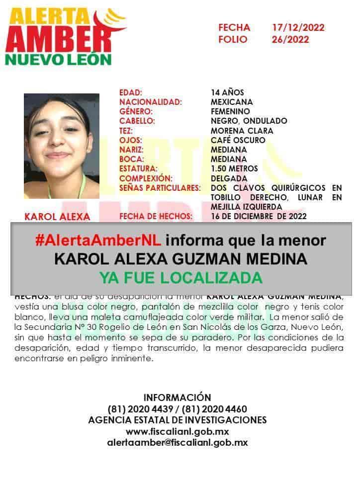 Karol Alexa Guzmán Medina, de 14 años de edad, fue encontrada por las autoridades en el DIF de Reynosa, Tamaulipas, lugar del que fueron avisados las autoridades de Nuevo León.