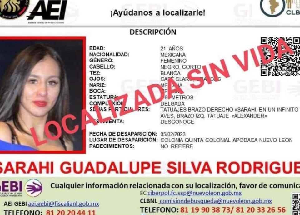 La ahora occisa fue identificada como Sarahí Guadalupe Silva Rodríguez, de 21 años, quien tenía reporte de búsqueda desde febrero.