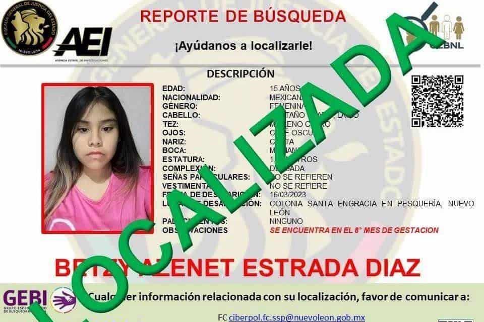 La Fiscalía General de Justicia del Estado, desactivó la Alerta Amber, después de ser ubicada la joven que tiene ocho meses de embarazo y había desaparecido en el municipio de Pesquería.