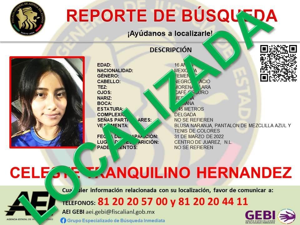 Se trata de Celeste Tranquilino Hernández, de 16 años, fue localizada con vida y ya se encuentra con sus familiares.