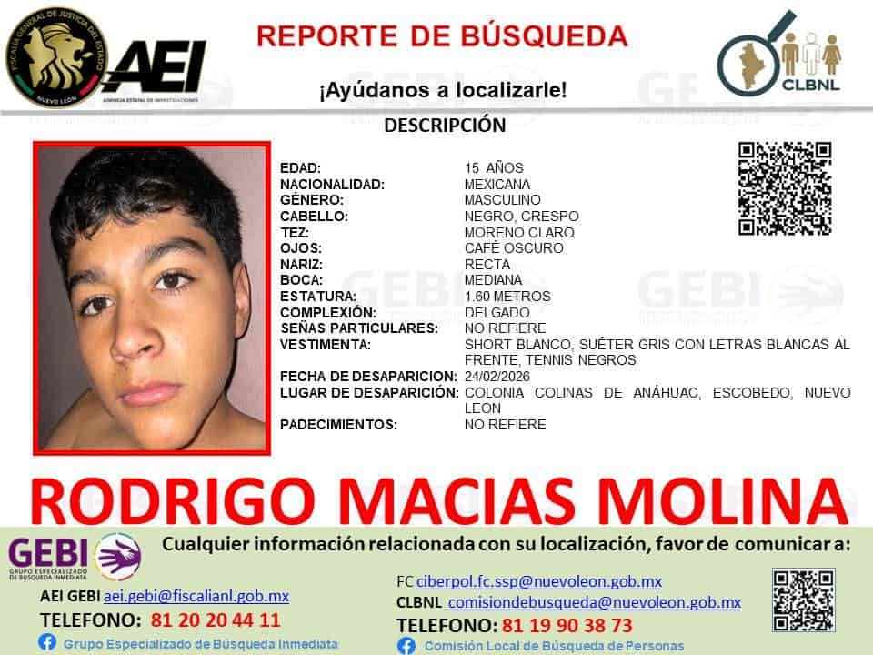 En una ficha emitida por la Fiscalía General de Justicia Especializada en Personas Desaparecidas, menciona que encontraba con bien a Rodrigo Macías Molina de 15 años de edad.