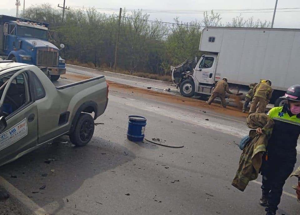 El camión de carga quedó a uno de los extremos de la carretera, en tanto que la camioneta en el otro sentido.