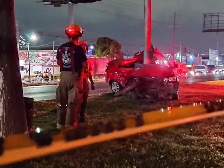 Indicaron que el automóvil primero brinco el camellón central de la avenida Miguel Alemán, y posteriormente, se estrelló contra la base del anuncio bandera.