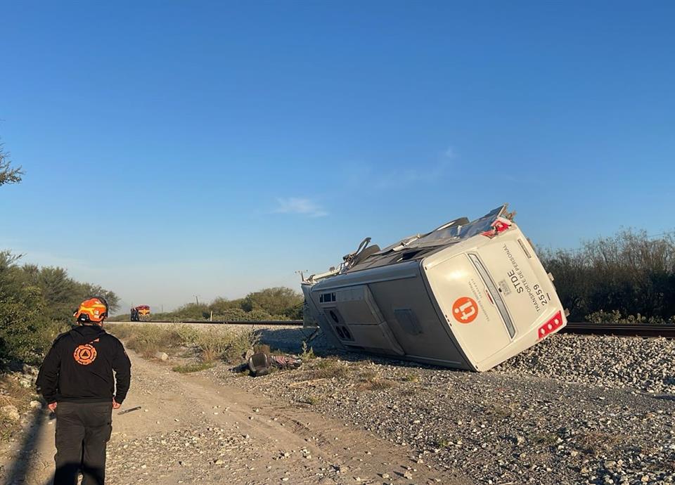 El chofer de un transporte de personal de la empresa TI y su acompañante murieron tras chocar contra el tren y volcarse, esta mañana en el municipio de Pesquería.