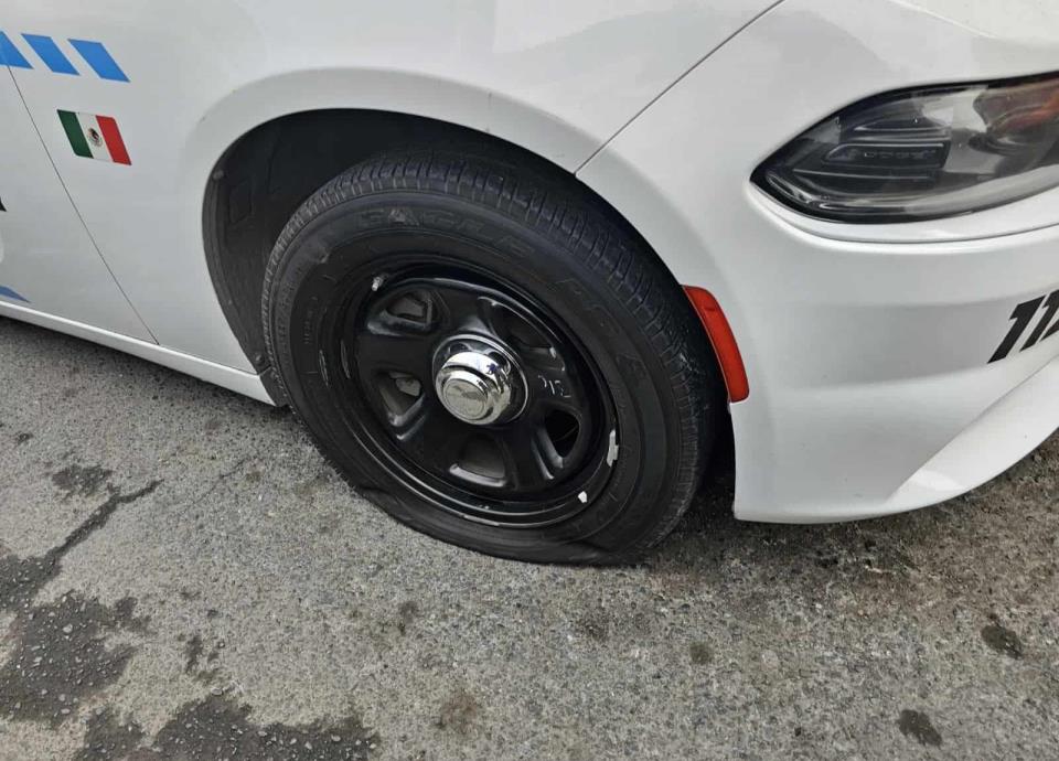 Al aproximarse para apoyar a su compañero, el presunto cayó al suelo con el picahielo en la mano, objeto con el cual, sin motivo alguno dañó las dos llantas traseras de la unidad y la delantera del lado derecho de la patrulla Charger, con número económico 1125.
