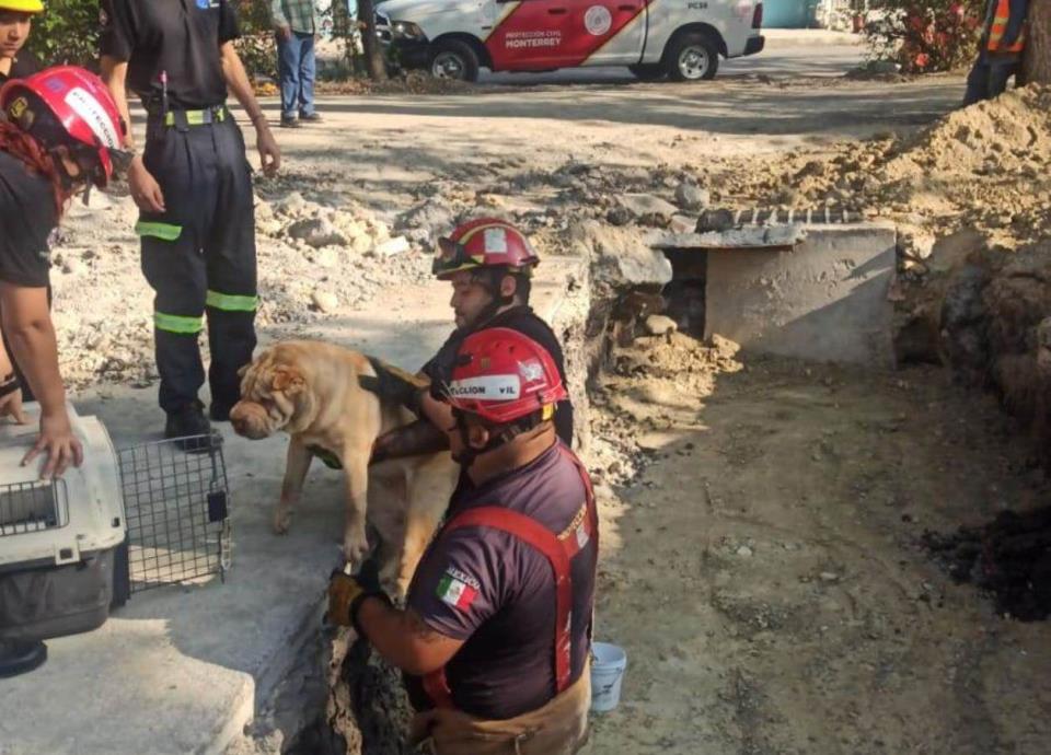 Luego del reporte de un perro que no podía salir de una zanja en el Fraccionamiento Buenos Aires, elementos de Protección Civil de Monterrey rescataron al can.