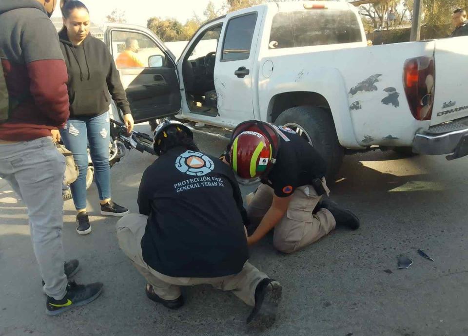 Un motociclista terminó con lesiones de consideración al estrellarse en seco contra una camioneta, que se atravesó a su paso en el municipio de General Terán.