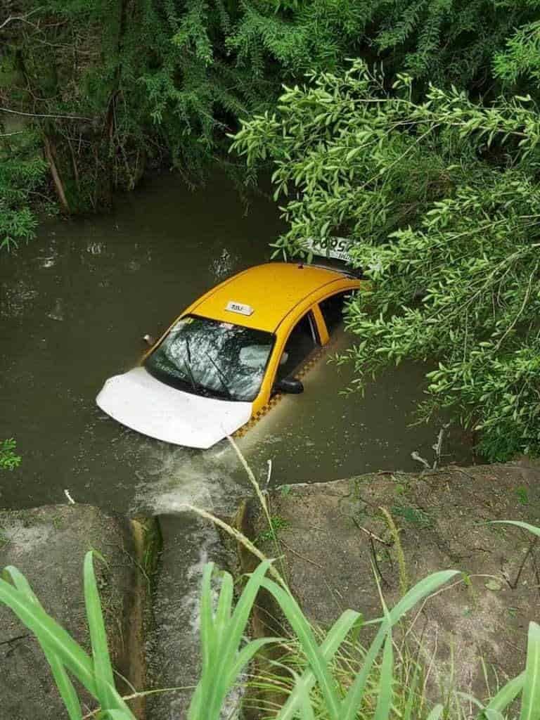 Tres delincuentes que robaron su unidad a un taxista en el municipio de Montemorelos terminaron por caer hacia un arroyo donde dejaron abandonado el vehículo.
