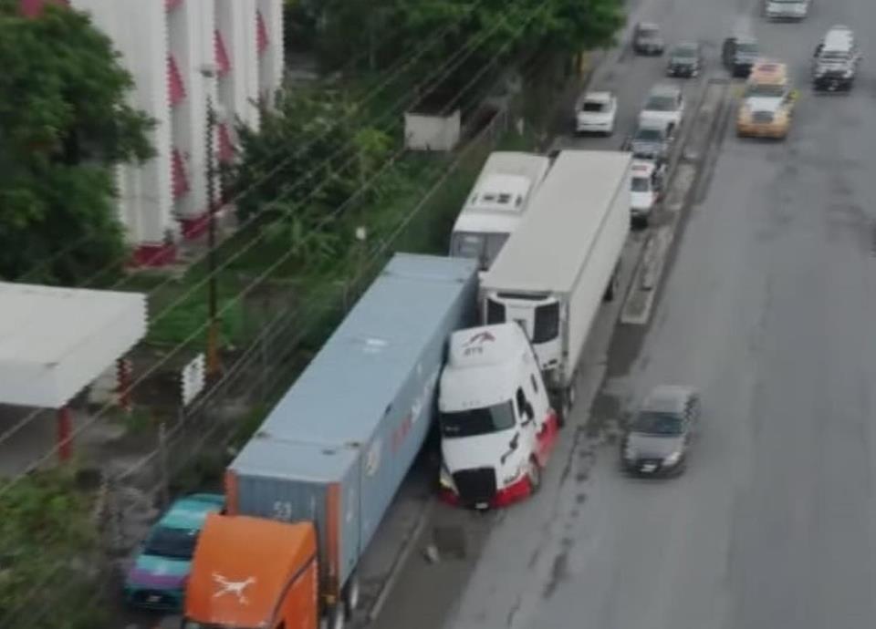 Un gran caos ocasionó un tráiler en los carriles laterales de la Carretera a Laredo, la caer la cabina a una alcantarilla sin tapa.