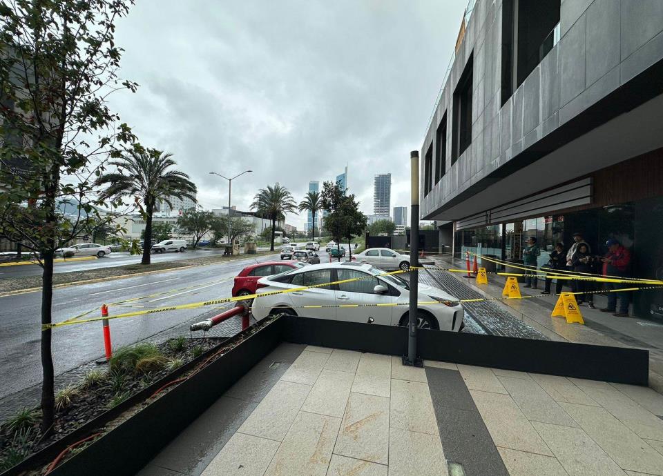 Se desprenden vidrios de edificio de San Pedro y dañan vehículos