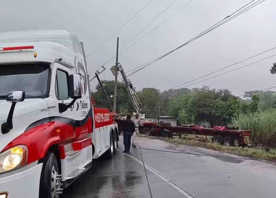 El pavimento mojado ocasionó que un tráiler derrapara sobre la carpeta asfáltica y chocara contra varios postes de la Comisión Federal de Electricidad, en el municipio de Cadereyta.