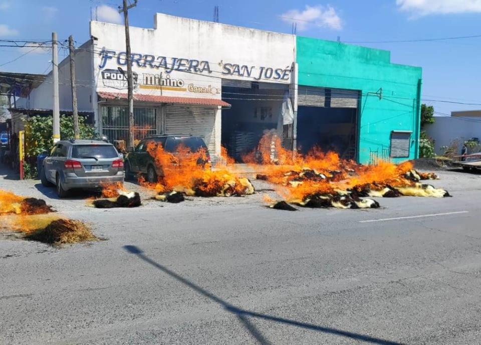 Una bodega, así como como una camioneta con remolque cargado de paja, se incendiaron este mediodía en el municipio de Cadereyta Jiménez.
