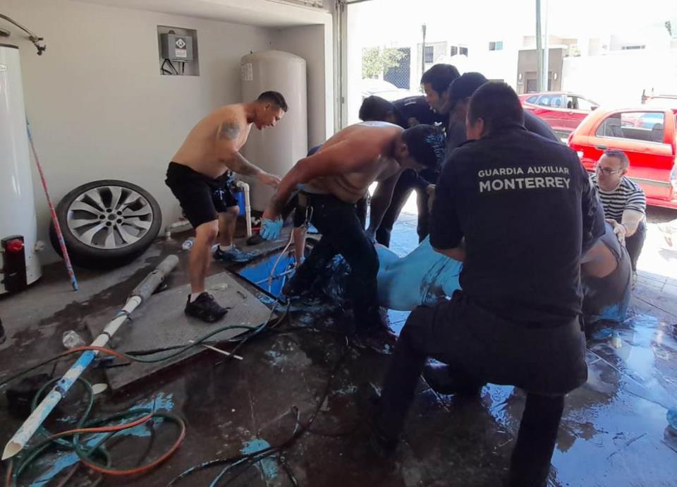 Tres trabajadores que pintaban el interior de una cisterna quedaron inconscientes al intoxicarse con solvente y fueron rescatados por elementos de la Secretaría de Seguridad Y Protección a la Ciudadanía Monterrey, en la Colonia Contry.