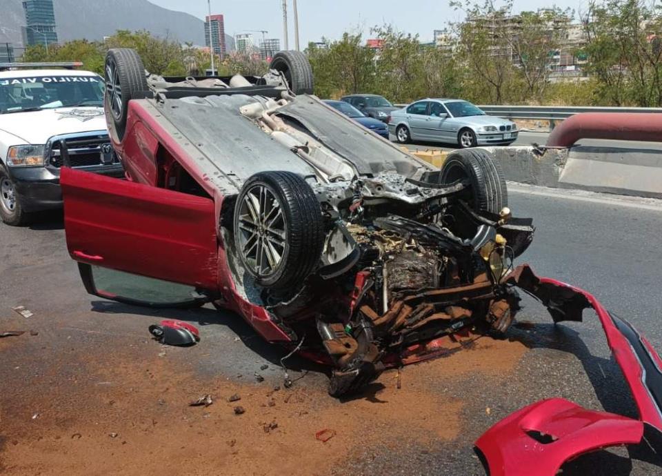 La unidad volcada es un vehículo Kia Río, el cual quedó con las llantas hacia arriba al subir el puente en el sentido de poniente a oriente de la Avenida Morones Prieto.