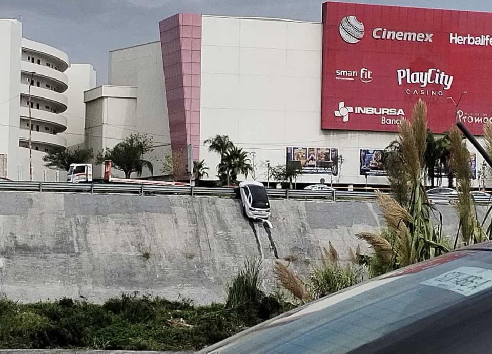 Un automovilista resultó lesionado tras perder el control de su auto, estrellarse, quedar colgado y enganchado de un barandal de protección, a punto de caer al Río Santa Catarina, en Guadalupe.