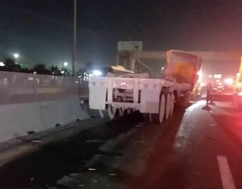En el percance vial, participo un tráiler de la marca Kenworth, color naranja con placas del Servicio Público Federal.