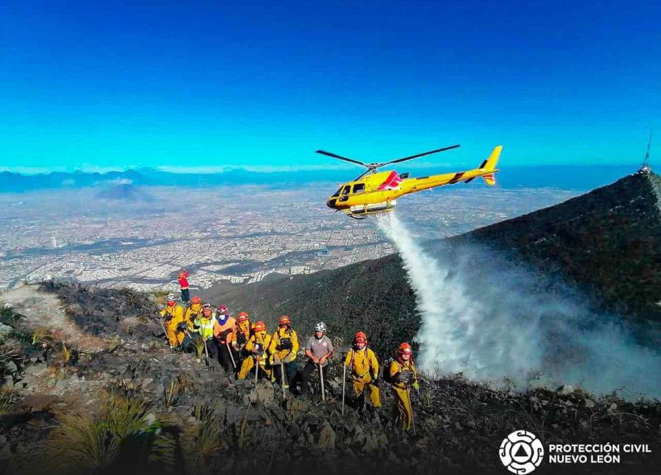 Al mismo tiempo un helicóptero de Gobierno de Nuevo León, realizó descargas de agua para atacar los puntos críticos del incendio forestal, a los que los brigadistas no podían llegar por lo accidentado del área.