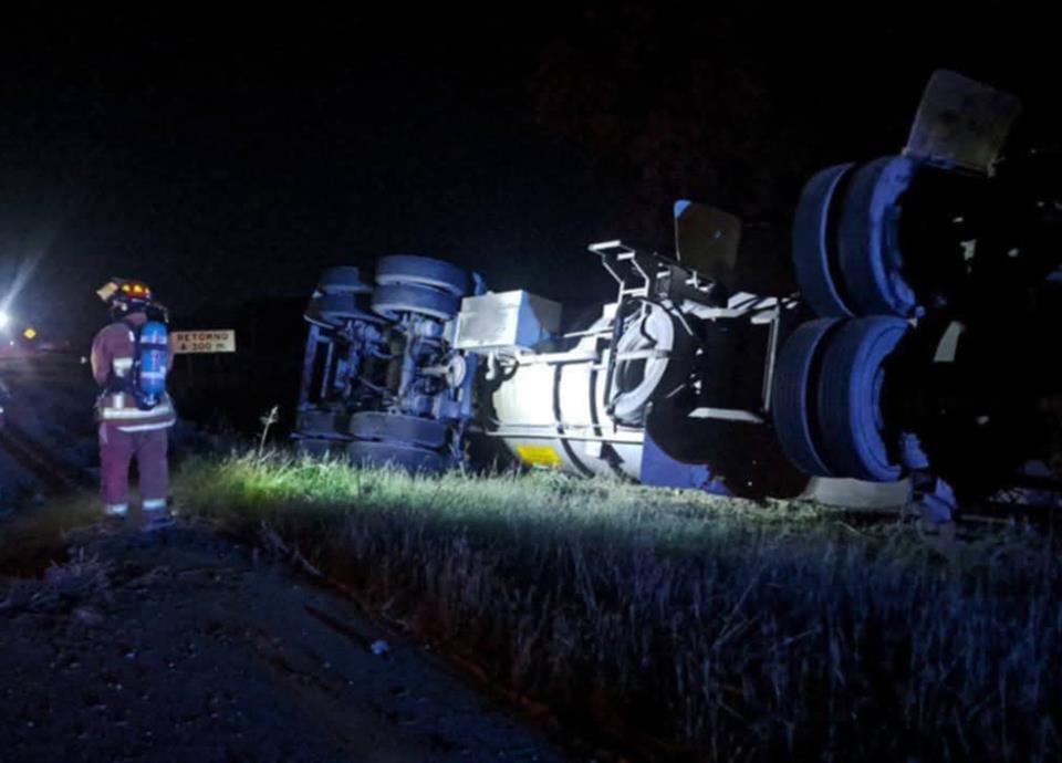 Se estableció que la unidad volcada era un camión con doble remolque, el cual queda volcado sobre el camellón central de la Carretera Nacional.