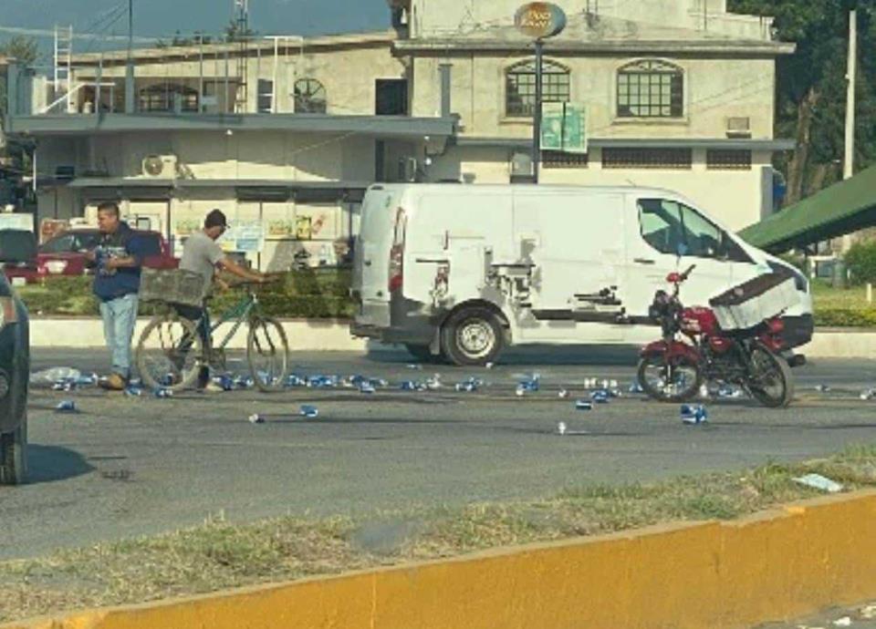 Un grupo de automovilistas detuvieron el tráfico de una importante avenida del municipio de Montemorelos, para tomar las latas de cerveza que regó un camión repartidor.