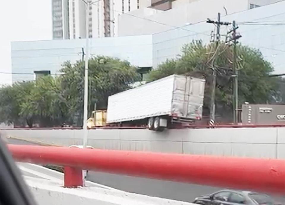 En otro caso, un operador de quinta rueda causó pánico entre los automovilistas que circulaban por la Avenida Vasconcelos, al trepar las llantas traseras sobre el muro de contención, en San Pedro.