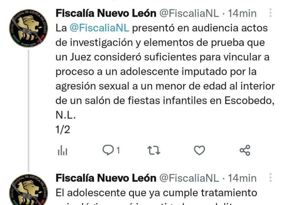 El pasado 11 de enero, la Fiscalía General de Justicia de Nuevo León hizo un comunicado con relación a los hechos, y tras una publicación en redes sociales en la que una madre de familia denunció la agresión sexual a su menor hijo por parte de un adolescente de 13 años en el municipio de General Escobedo.
