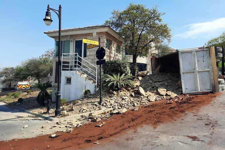San Pedro Garza Grcía, NL.-Un chofer salió ileso luego de volcar un camión cargado con piedra cantera, al presuntamente quedarse sin frenos en el Fraccionamiento Colonial San Agustín, en San Pedro.