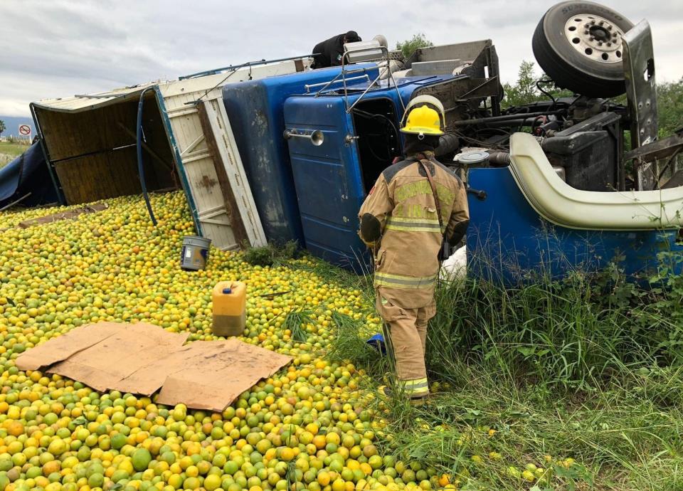 Un camión tipo torton que llevaba un cargamento de naranjas, se volcó en la Carretera Linares Galeana, al sur de Nuevo León, sin que se reportaran lesionados.
