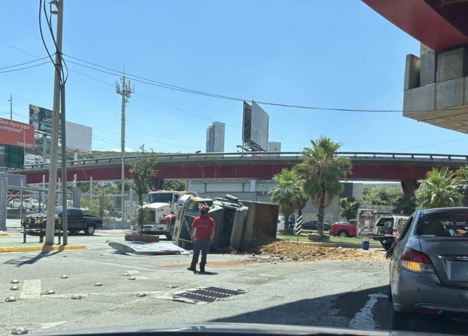 Al tomar la curva del complejo vial para incorporarse a Morones Prieto, el camión de volteo volcó y con ello obstruyó los carriles de ese lugar.