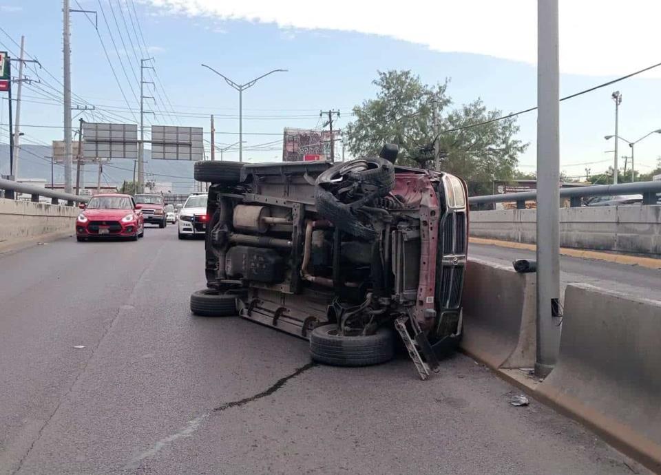 La camioneta, una Nitro color rojo, con placas de Nuevo León, quedó volcada sobre su costado del lado izquierdo, junto al comenzar el paso vehicular subterráneo de Rangel Frías y Avenida Gobernadores.