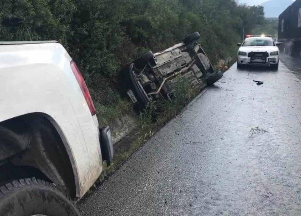 Monterrey N.L.- Una mujer sufrió diversas lesiones al volcarse el automóvil en que viajaba, después de estrellarse contra una camioneta, que también terminó en un pequeño canalón en el municipio de Montemorelos.