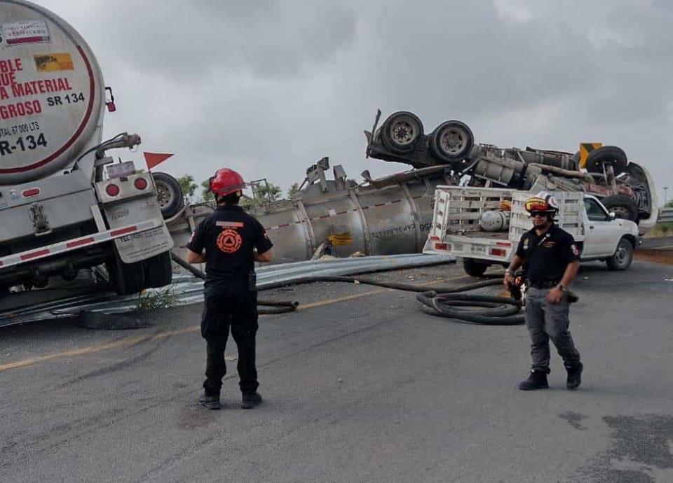 En el lugar los rescatistas trabajaron en el control del tanque con capacidad de 33 mil 500 litros, en el lugar se delimita el área para trabajar en el transvase del producto y se trabajó en una fuga.