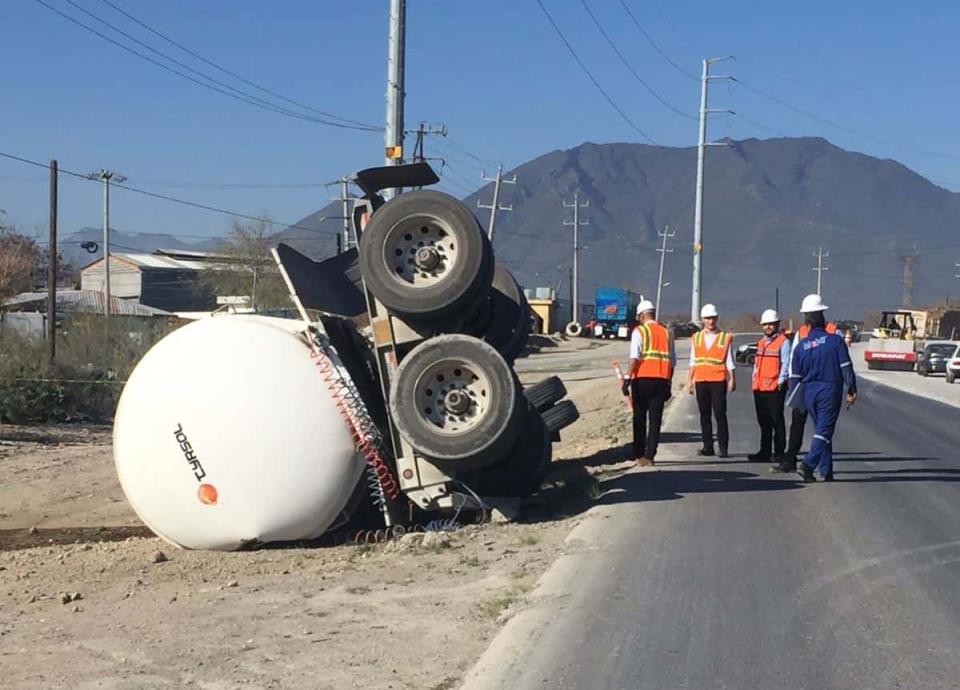 La volcadura se registró en el kilómetro 24.5 de la Carretera, donde al arribar al lugar elementos de Protección Civil de Nuevo León, encuentran un autotanque volcado sobre la orilla de la carretera.