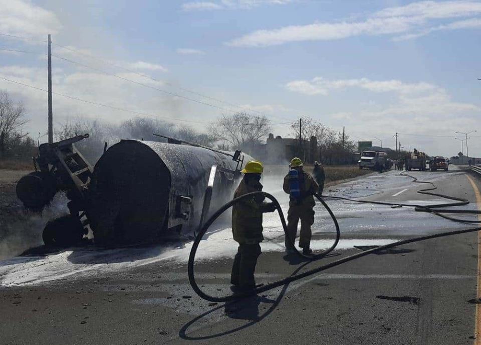 Una pipa que transportaba gasolina volcó y se incendió en la Carretera Nacional en Montemorelos, bomberos lograron sofocar el siniestro, cuatro horas después.