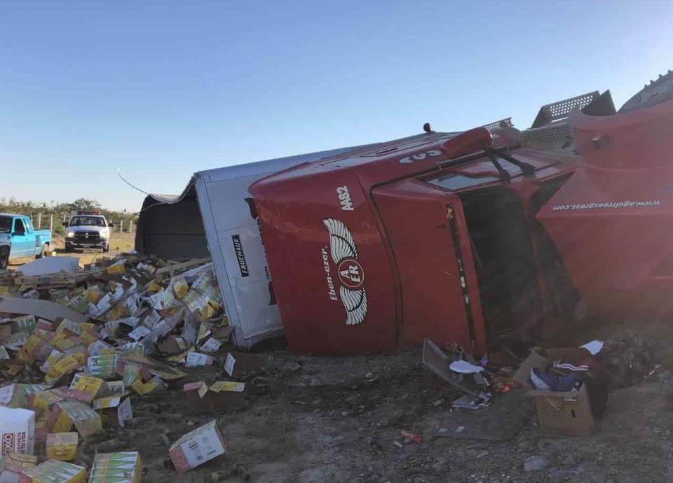 La volcadura de un tráiler cargado con botellas de agua minera en la Carretera a Laredo, municipio de Vallecillo, movilizó esta tarde a elementos de Protección Civil Nuevo León, quienes atendieron al conductor de la unidad.