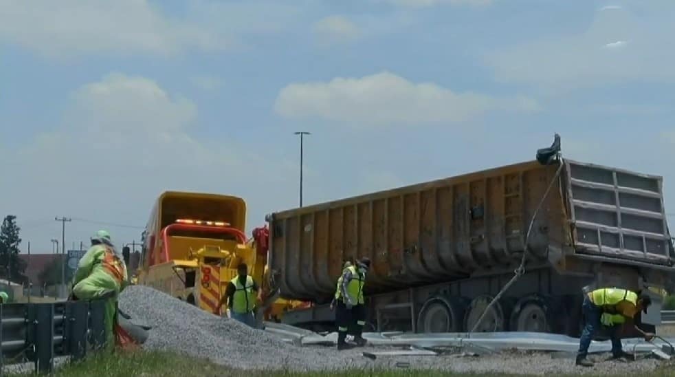 Monterrey N.L.- Un tráiler cargado con varias toneladas de grava, terminó volcado en un costado de la carretera Monterrey-Laredo, cuando la carga se ladeo hacia el costado derecho en Apodaca.