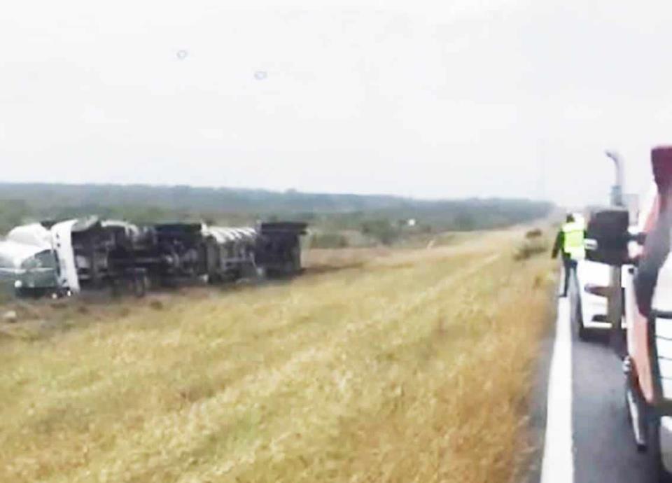 Un tráiler cargado con más de 35 mil litros de gasolina se volcó en un tramo de la Carretera Monterrey-Reynosa, en el municipio de General Bravo.
