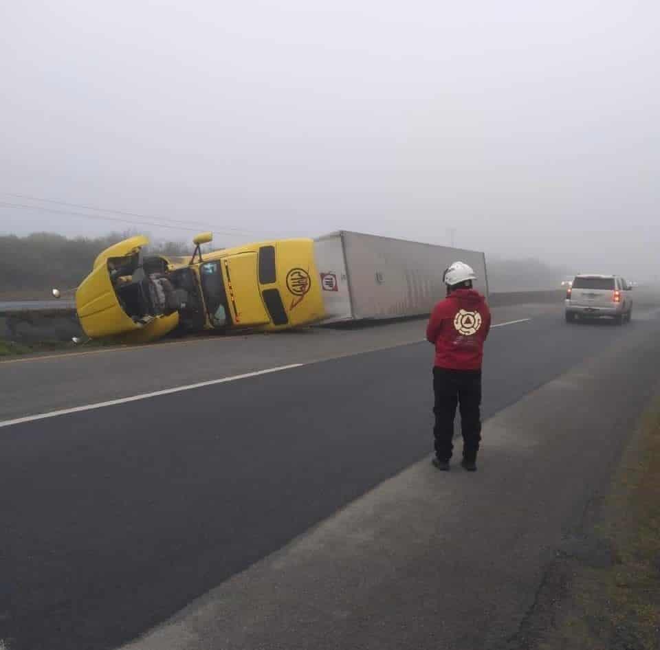 El trailero dijo que por el cansancio cerro los ojos y cuando los abrió, su unidad ya estaba volcada hacia el costado izquierdo.