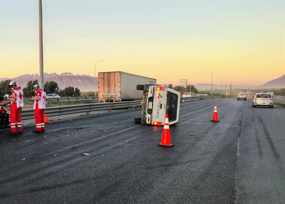 La ambulancia accidentada es la número 8 del municipio de Pesquería, en tanto la unidad volcada una camioneta Jack.