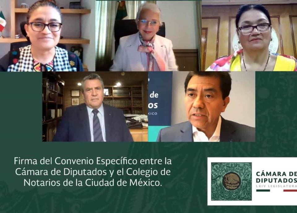 La Cámara de Diputados y el Colegio de Notarios de la Ciudad de México firmaron, de manera virtual, el Convenio Específico de Colaboración, con el objetivo de brindar información en materia testamentaria y notarial, en el marco de la campaña “Septiembre, mes del Testamento”.