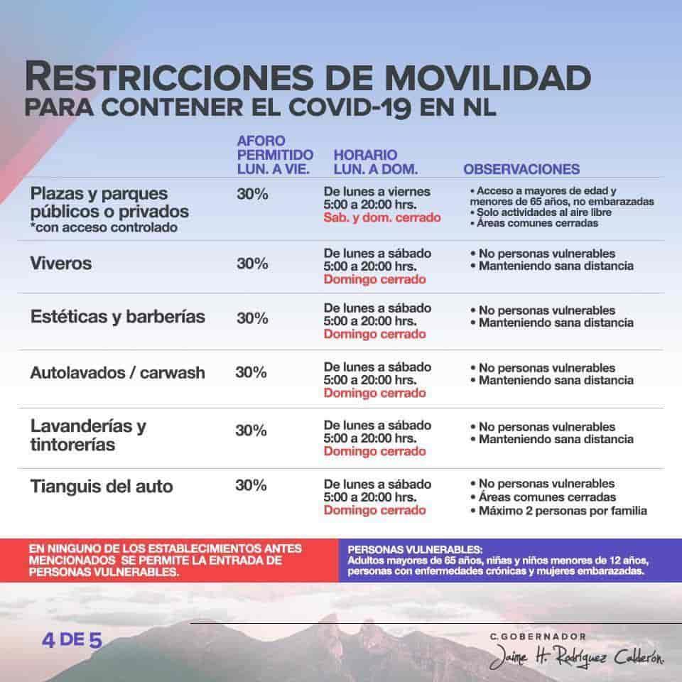 Ante la presión que ejercieron personas dedicadas a la realización de ejercicios, las plazas y parques públicos y privados, como el Fundidora y Chipinque, podrán volver a operar, además, estableció un nuevo límite en el número de personas que se pueden reunir en una casa, la cual será de 10 asistentes como máximo.